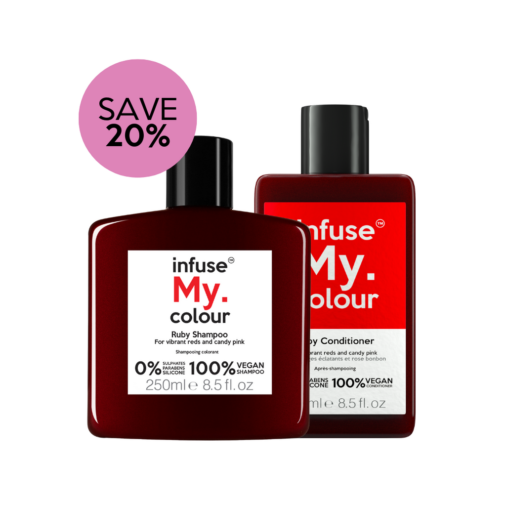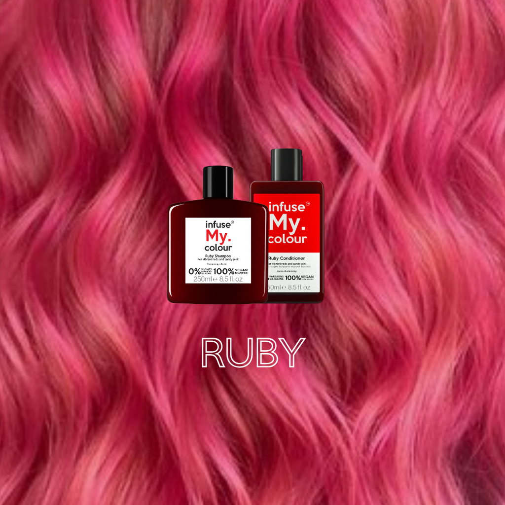 infuse My. colour Ruby Shampoo and Conditioner adds a warm subtle red glow to dark brown hair and rich red tones to light brown hair. The product will refresh coloured red hair as well as adding vibrancy and for bleached hair, the infuse My. colour Ruby Shampoo creates striking pink tones on bleached hair and on light brown hair, it will add a deep red hue.