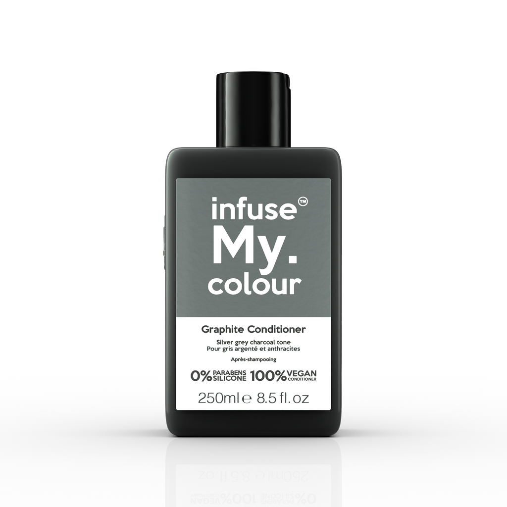 The Graphite Conditioner, used along infuse My. colour Graphite Conditioner, creates steel-like charcoal tones, cancelling out orange colours to create a striking graphite colour.